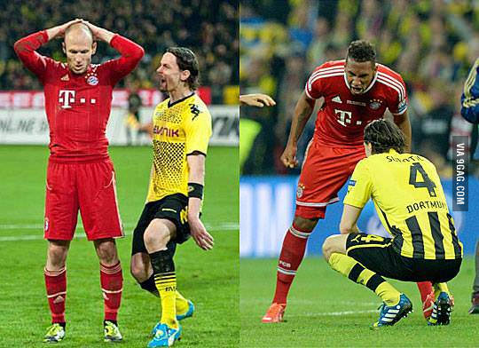 Een mooi voorbeeld tussen de strijd van Bayern en Dortmund is dit: Arjen Robben miste ooit een penalty tegen Dortmund. Centrale verdediger Neven Subotic van Dortmund lachte hem daarvoor keihard uit (zie de afbeelding hieronder). Later, wanneer Robben de winnende scoorde in de Champions League finale tegen Dortmund, nam Jerome Boateng revanche. Boateng liep na het laatste fluitsignaal naar Subotic toe en schreeuwde van blijdschap keihard in zijn gezicht.